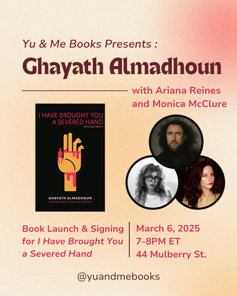 ![[Event] Book Launch | I Have Brought You a Severed Hand by Ghayath Almadhoun](http://www.yuandmebooks.com/cdn/shop/files/3.6.25GhayathAlmadhoun.png?v=1740584853&width=1445)