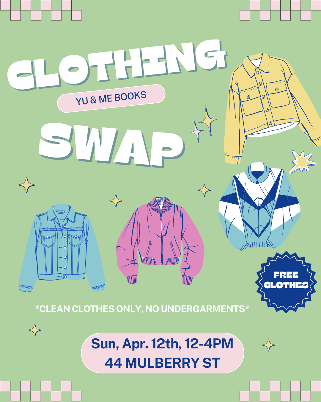 FREE CLOTHES! Join us for our first Clothing Swap of the year! Bring CLEAN, gently worn clothes you would give to a friend and take anything you'd like. *Please no undergarments*