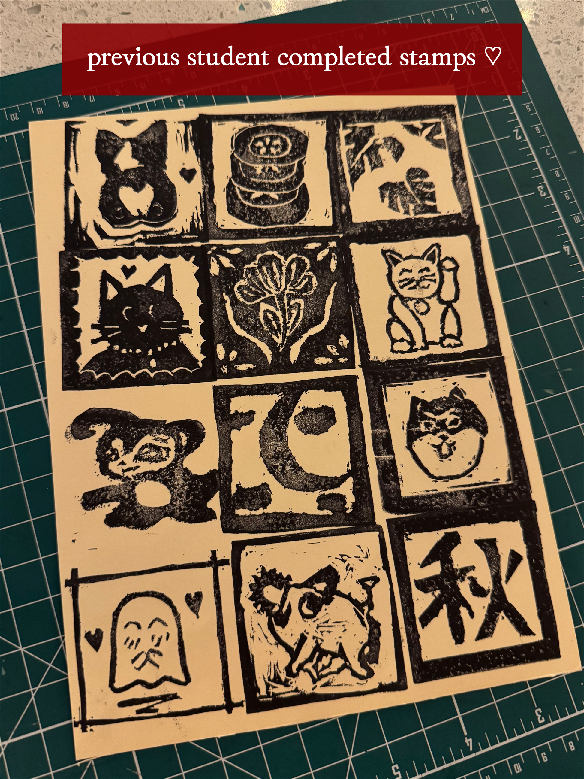 - Leave with your own carved stamp + Block Print 101 Guide to keep and continue printing on your own!